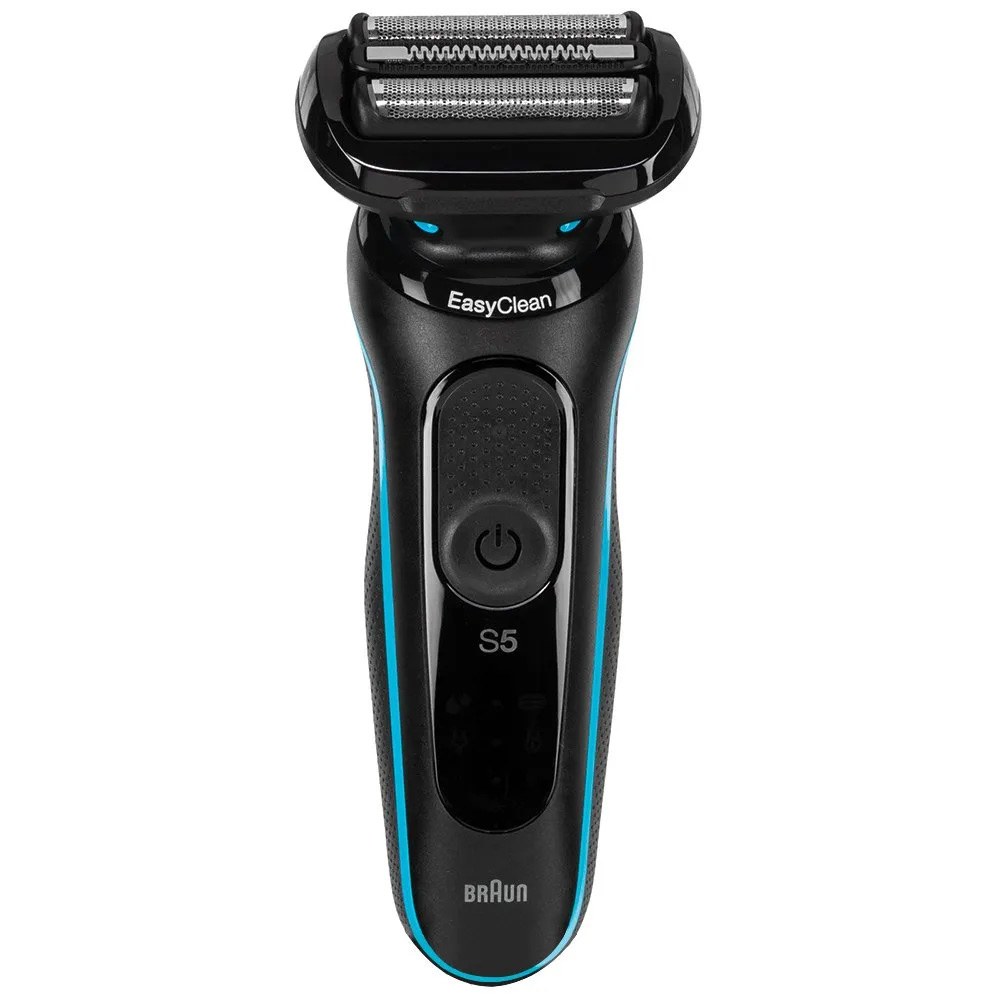 Máquina de barbear elétrica recarregável série 5 com lâminas de alta qualidade. barbear fácil, limpo e apurado com 3 lâminas flexíveis, 2 lâminas sensofoil, 1 aparador central e pente microcomb. fácil limpeza sem retirar a cabeça de barbear através do sistema easy clean. 100% resistente à água, adequada para uso em seco ou molhado. bateria recarregável com autonomia até 50 min. carga em 1 h e carga rápida em 5 min. conteúdo: máquina de barbear, capuz protetor, escova e carregador