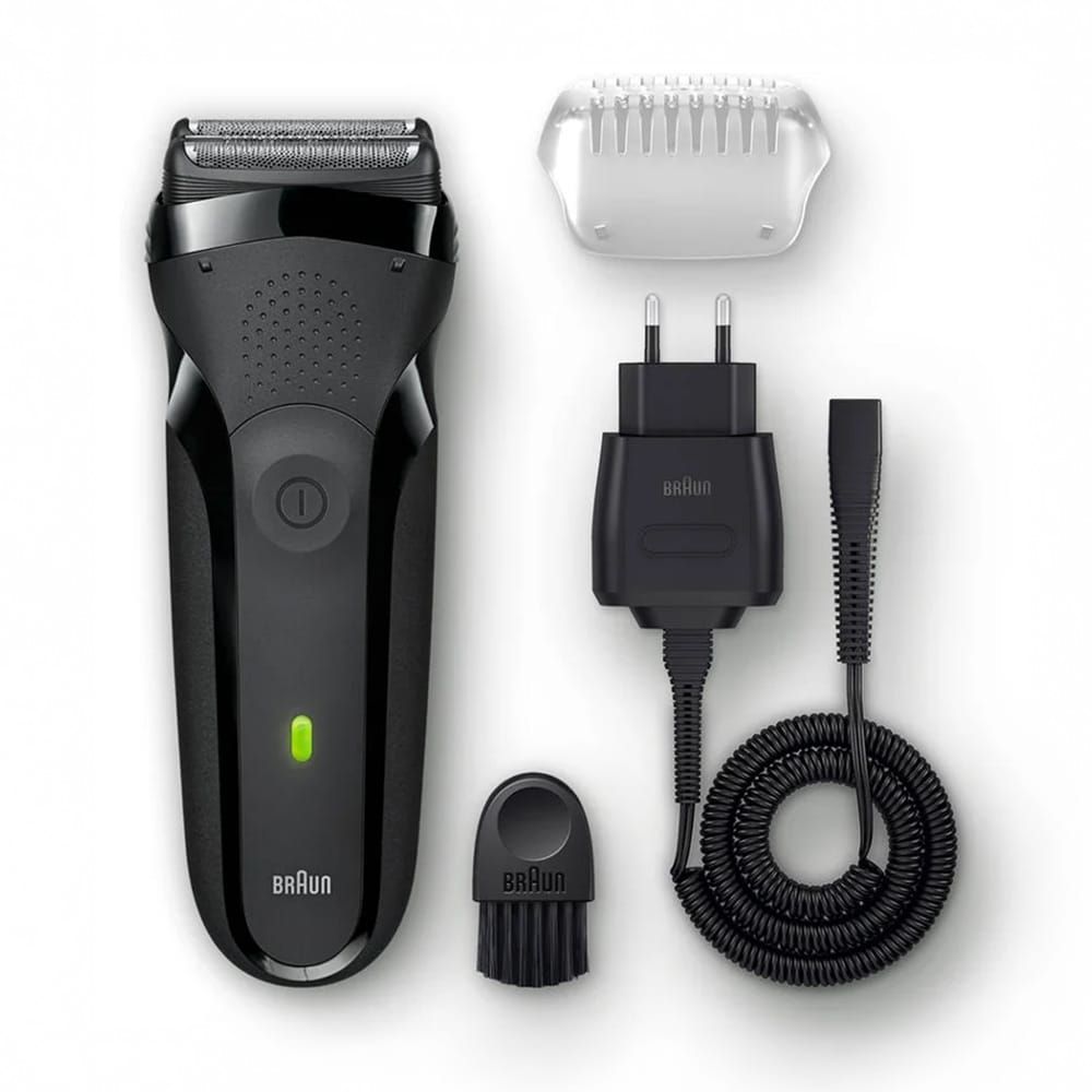 Barbeador elétrico série 3. com potência de 7 w e tensão 100 – 240 v. sistema de corte de tripla acção, em duas laminas e um cortador intermédio. a carregar durante 1 h, 20 min de tempo (aproximadamente). disponível para carregamento rápido se necessário apenas 5 min. pode aumentar a profundidade de 5 m