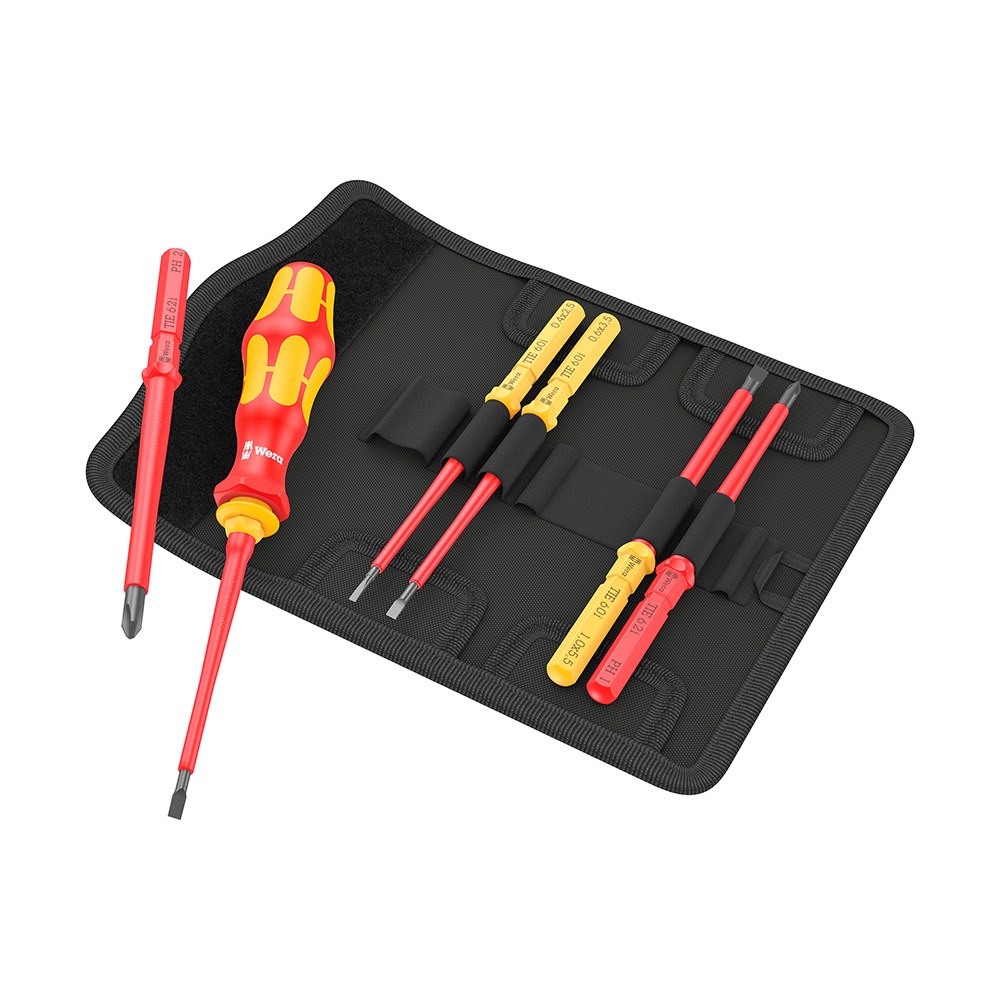 IVA incluídoChaves de fendas vde, universal 1, 7 peças, ferramenta testada a 100 % segundo iec 60900 a 10.000 v, sistema antirrolamento, busca de ferramenta take it easy com marcas a cores e gravação a laser, um cabo porta-pontas kraftform 817, seis hastes intercambiáveis de 157 mm: 1xph1, 1xph2, 1×0,4×2,5, 1×0,6×3,5, 1×0,8×4,0, 1×1,0x5,5 mm, bolsa dobrável para cinto autoadesiva robusta, adequada para wera 2go