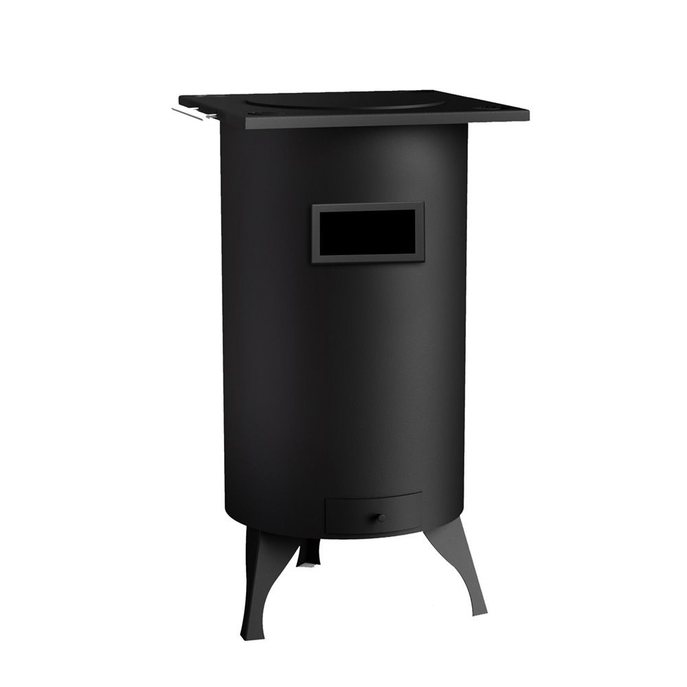 Churrasqueira / aquece pratos redonda fm bh7 com saída de fumos traseira ø42 x 78,4 cm. área: 200 m³. combustível: lenha de 55 cm. potência calorifica: 8 kw. peso:27 kg – tubo de saída: ø120 mm (masculino). fabricada em aço de carbono decapado dd11