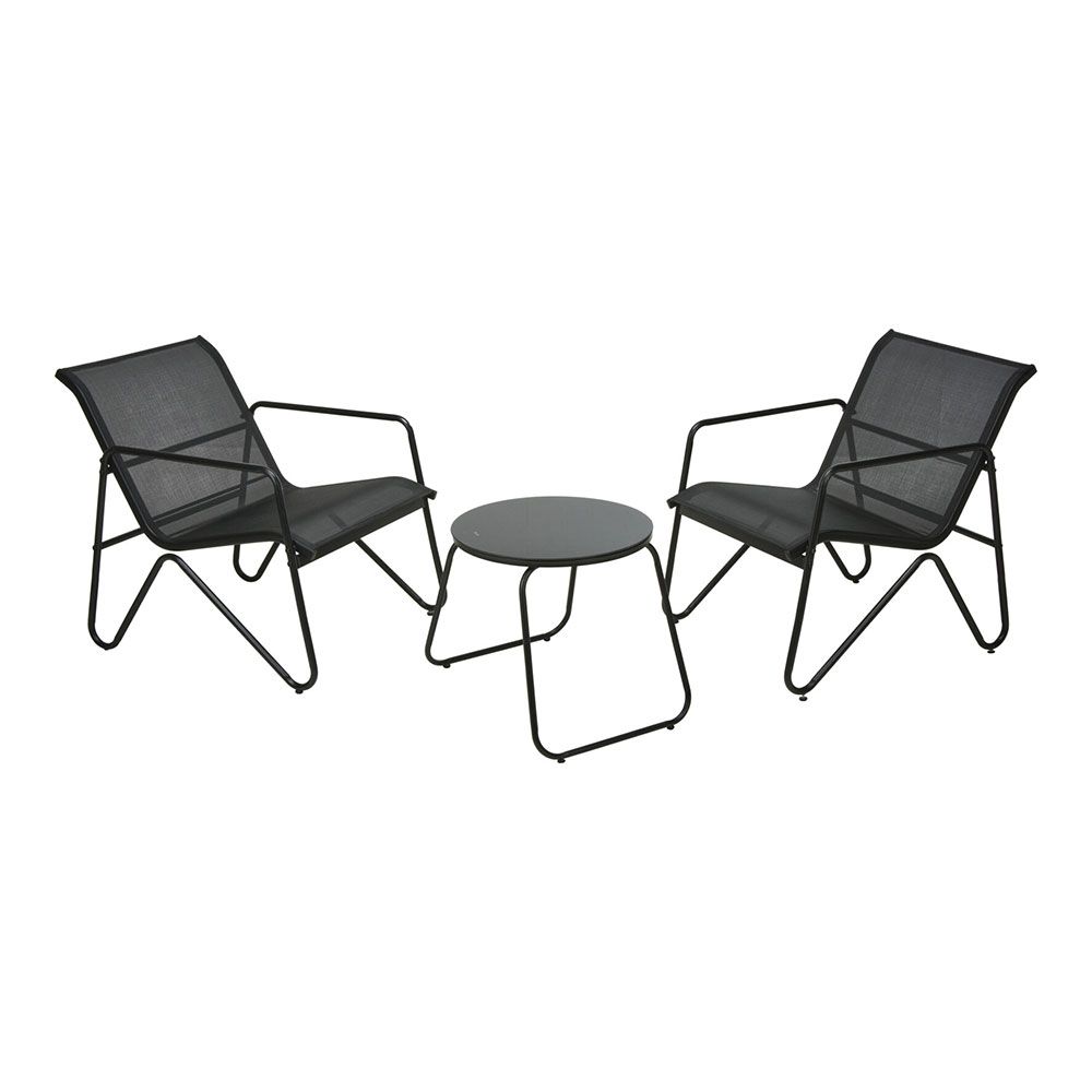 Conjunto de jardim de 3 peças em metal antracite. inclui duas poltronas e uma mesa, feitas de tecido textilene resistente às intempéries e tubos de aço com pintura eletrostática preta. fácil de montar e guardar. dimensões da poltrona: 58 x 76 x 75 cm. dimensões da mesa: ø47 x 43 cm