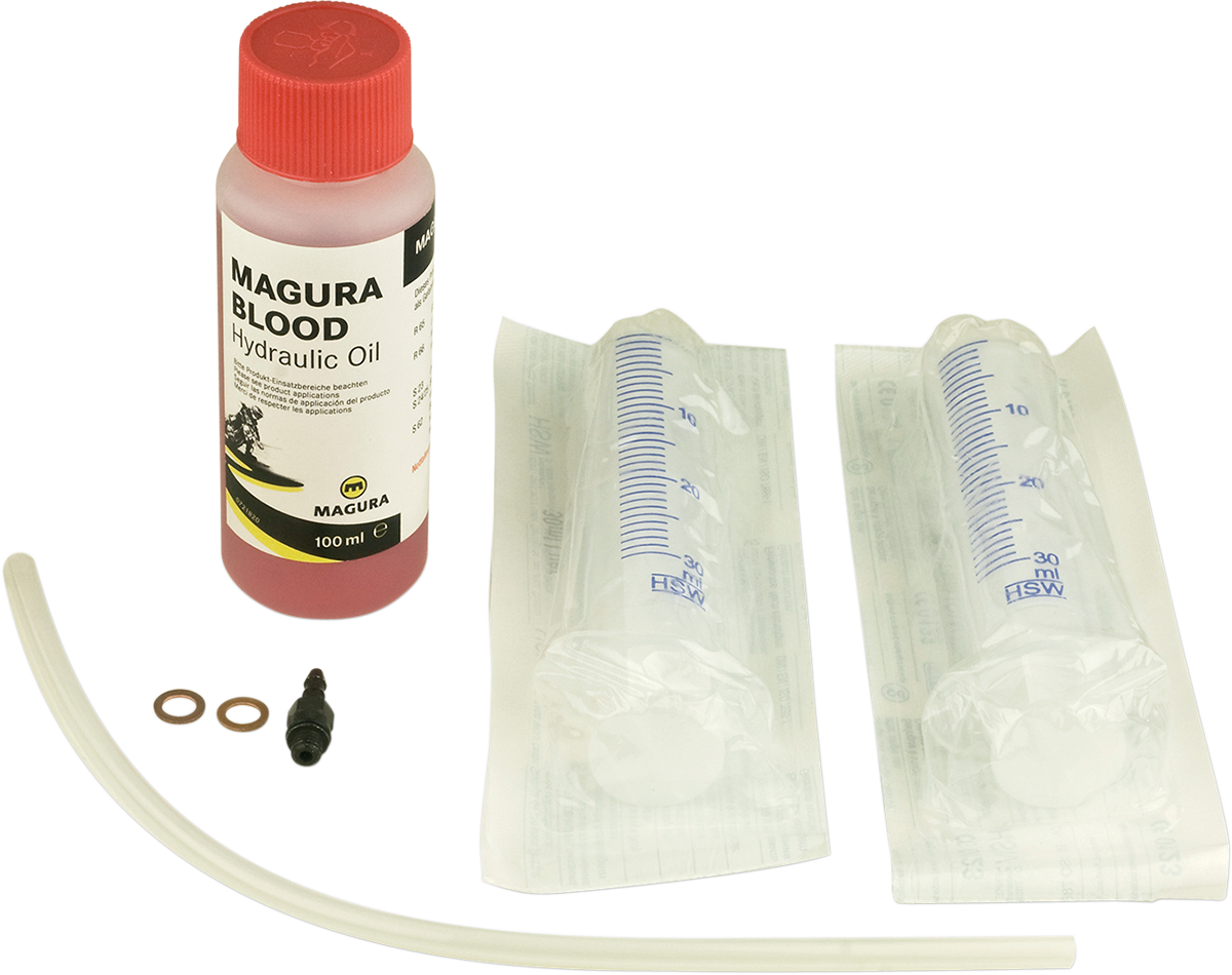 IVA incluídoKit completo para manutenção de embraiagens hidráulicas Magura, incluindo seringas, mangueira e 100ml de óleo mineral Magura Blood. Ideal para substituir ou refrescar o óleo da sua embraiagem com facilidade e sem bolhas de ar.