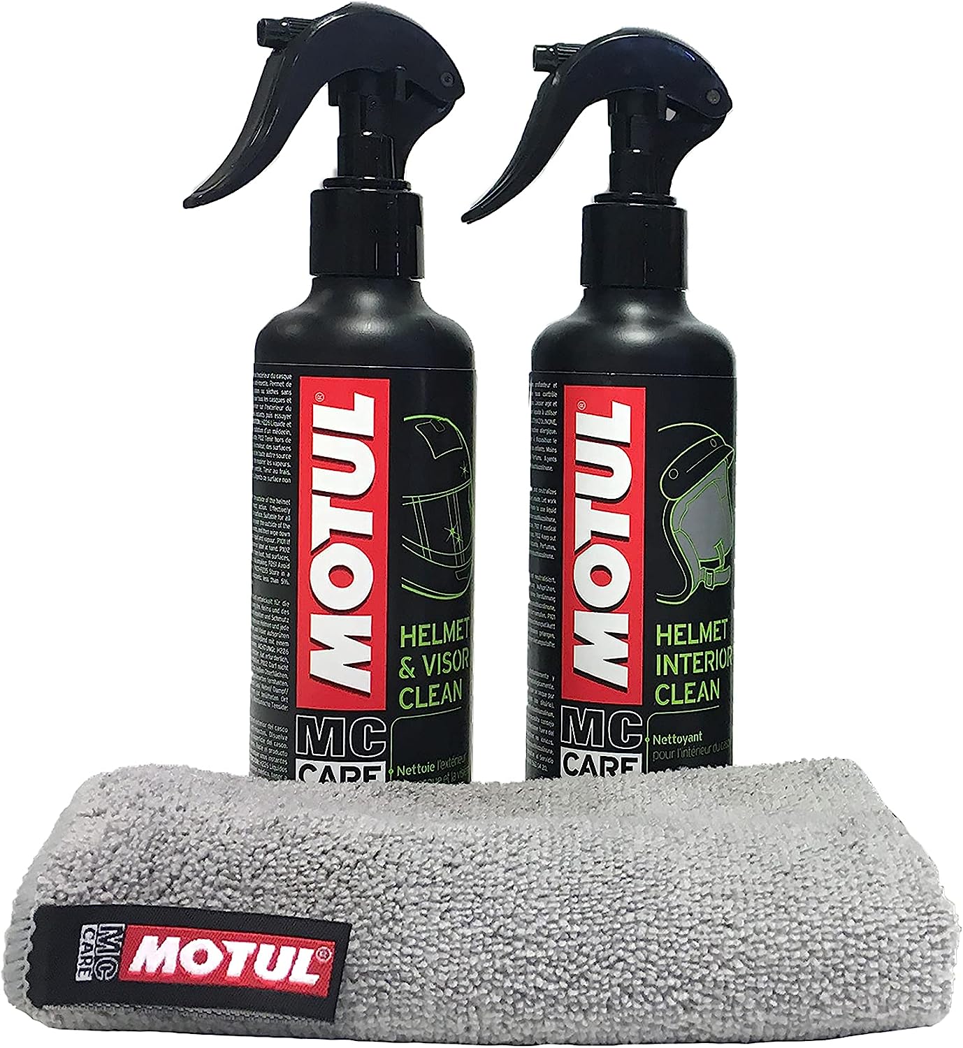 IVA incluídoKit de limpeza Motul para capacetes inclui sprays M1 e M2 de 250ml para limpeza exterior, viseiras e interior, eliminando odores. Acompanha pano de microfibra para acabamento perfeito.