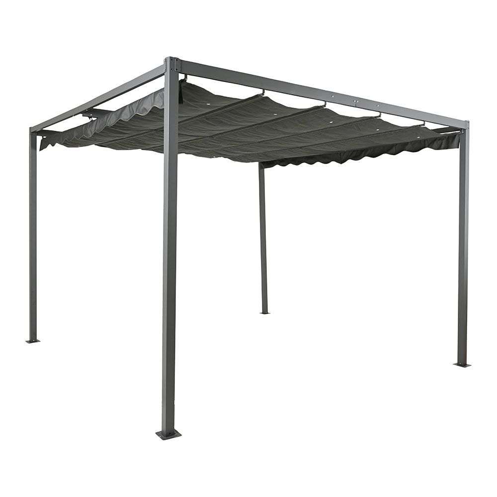 IVA incluídoPérgola de exterior em alumínio cinza antracite de alta qualidade, com tubos de 28 x 70 x 1 mm e tubos de ferro de 60 x 60 x 1 mm. possui acabamento fosco e tecido de poliéster com proteção uv 400. dimensões: 3 x 3 x 2,20 m