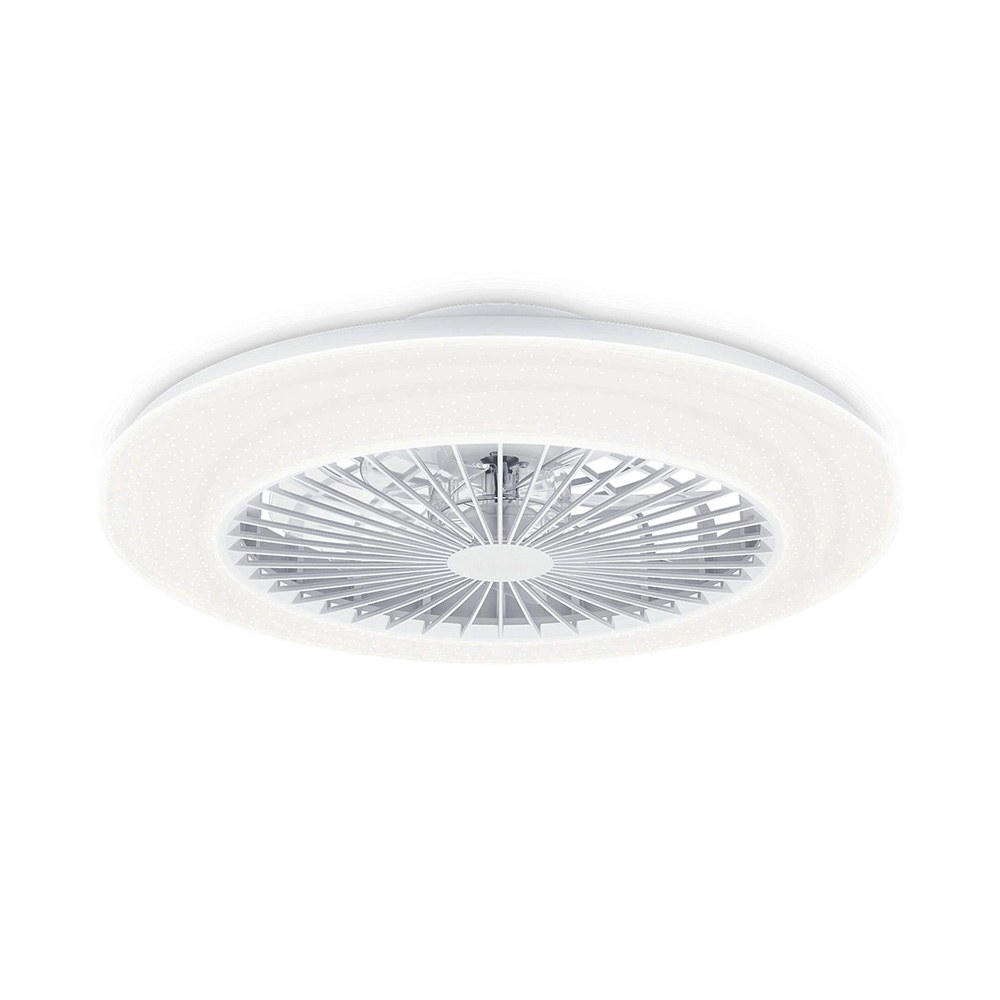 Ventilador de teto led 3 cct, cor branca com difusor opalino, modelo amigo, 60 w, 6500 lm, tipo de fluxo luminoso 360°, 3 tons de luz: 3000- 4400 – 6500 k, com intensidade regulável, luz noturna, vida útil nominal 15.000 h, fluxo de ar natural + 6 velocidades, função inversa inverno-verão, motor ultra silencioso dc 25 w, função temporizador: 1 / 2 / 4 h, tensão: 220-240 ca, ip20, com comando à distância (pilhas não incluídas), inclui elementos de fixação. dimensões: ø57,7 x 14,2 cm